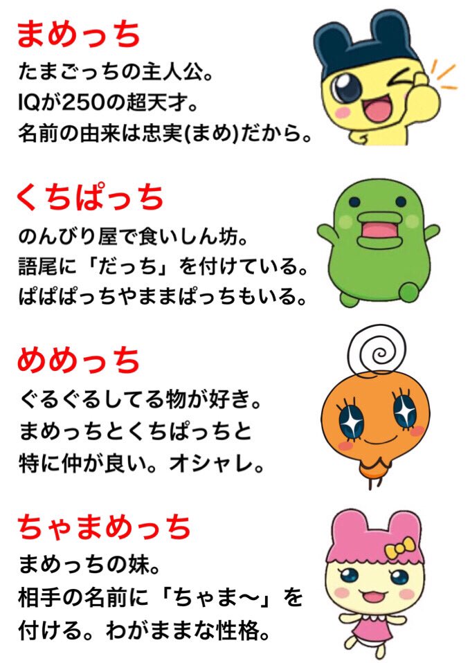 たまごっち キャラクター めめっち- たまごっち初代の遊び方育て方、基本的な操作方法をご紹介致します。 初代たまごっちの復刻版が17年11月23日に発売されました。 当時のパッケージ、本体のフォルム、キャラクターを再現しての登場です。 そんな折に、押し入れの隅にあった初代たまごっちを取り出してやってみたけど、育成方法なんて忘れてしまって、どうしたら良いか分からないという方もめめ属のたまごっちは、オシャレで、楽しいことが大好き。 「めめ属」と「めめ属」、「めめ属」と「まめ属」の組み合わせから生まれた子供は、「めめ属」になるんだよ! 「くち属」のキャラクター くち属のたまごっちは、やさしくて、のんびりした性格だよ。 「くち属」と「くち属」、「くち属」と「めめ属」の組み合わせから生まれた子供は、「くち属