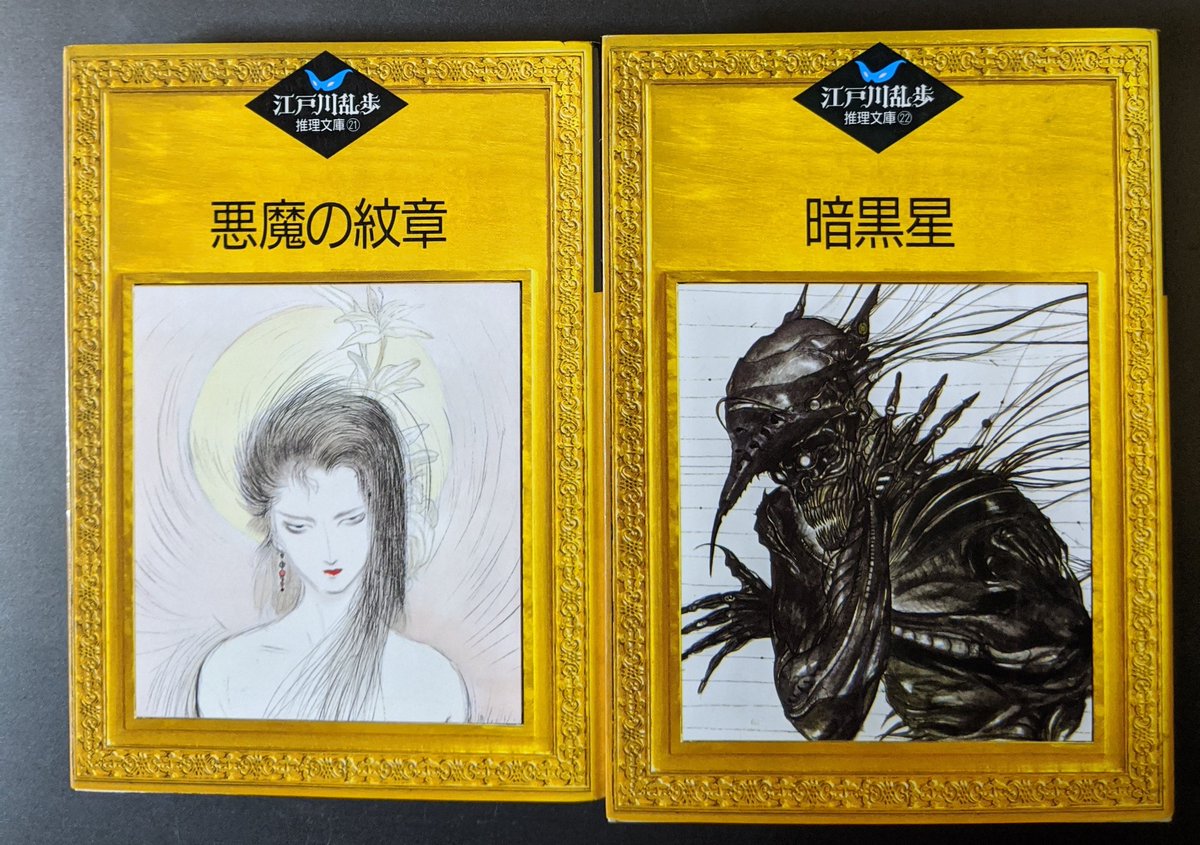中野 一茂 江戸川乱歩氏 装画 天野喜孝氏 悪魔の紋章 暗黒星 江戸川乱歩推理文庫21 22 いずれも初版 講談社 ネットにて 2冊同時に到着 悪魔の紋章を再読 復讐に気を遠くなるぐらい時間をかけるお話 久しぶりに読むと新鮮 番台もあと少しでコンプ